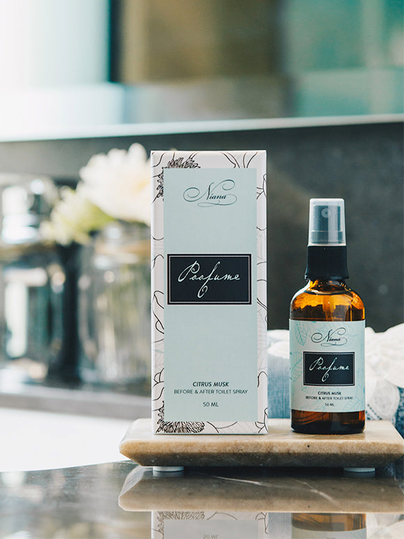 Guest Bathroom: No more embarrassing smells or cleaning up after your guests at a dinner party! Poofume, our, our Before & After Toilet Spray, is a must-have for all bathrooms. A blend of citrus, musk and sandalwood creates a shield and blocks any unpleasant odor.