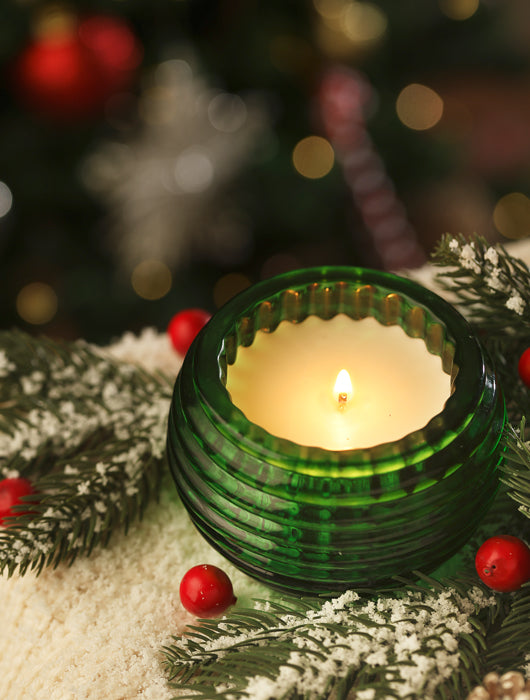 A cosy blend of crisp pine and warm cedarwood - bring home the scent of a winter forest. Fresh, woody and grounding, this candle sets the perfect holiday mood. Reminiscent of vintage ornaments, the ribbed emerald jar will elevate your Christmas decor. A thoughtful gift for your loved ones.