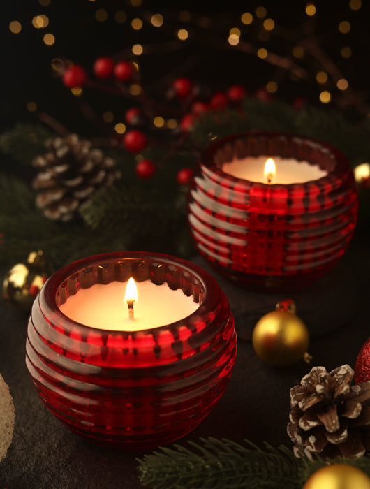 A cosy blend of crisp pine and warm cedarwood - bring home the scent of a winter forest. Fresh, woody and grounding, this candle sets the perfect holiday mood. Reminiscent of vintage ornaments, the ribbed ruby jar will elevate your Christmas decor. A thoughtful gift for your loved ones.